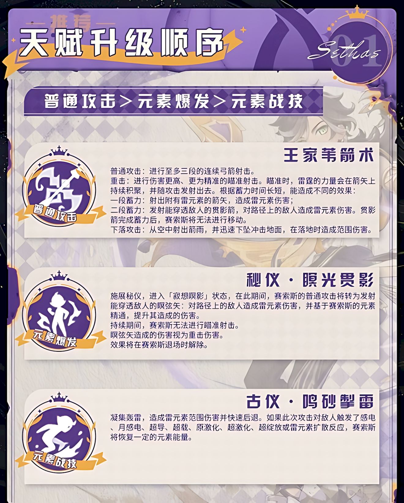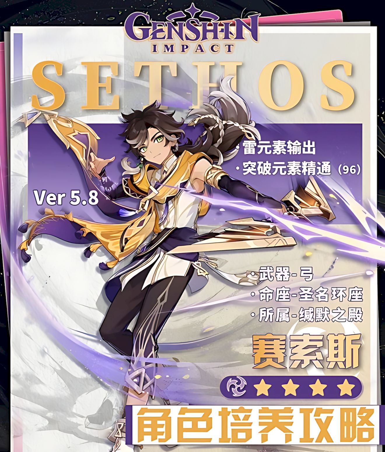 原神中雷元素弓系角色赛索斯,所属缄默之殿命座为圣名环座,定位输出且突破加成元素精通,培养需兼顾天赋、武器、圣遗物与配队搭配。不少玩家在养成过程中面临方向困惑,本文整合该角色核心培养要点,涵盖天赋升级顺序、专属装备选择、实用队伍组合及各类材料需求,助力高效提升战力。