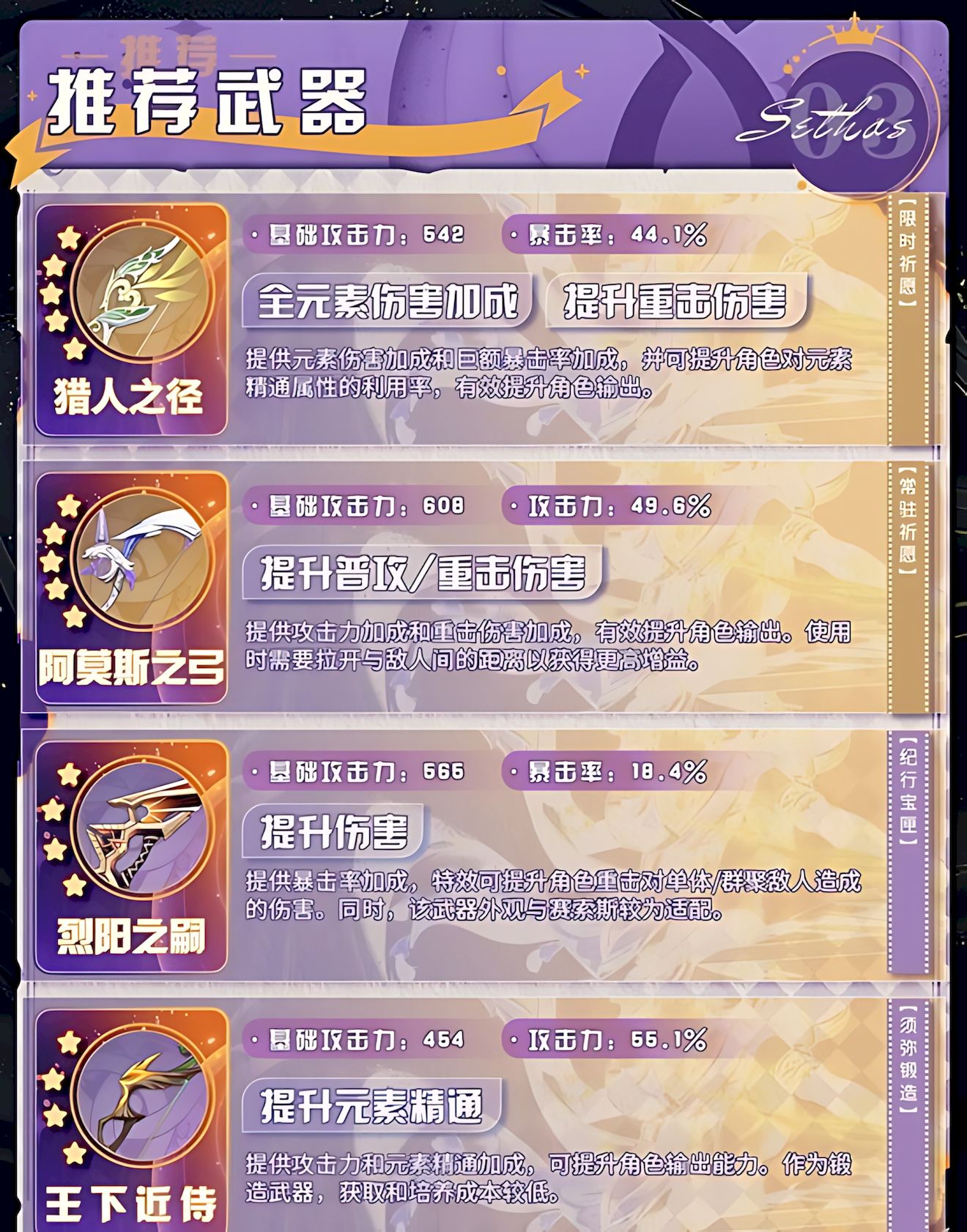 2、武器推荐猎人之径阿莫斯之弓烈阳之嗣王下近侍,分别提供暴击率元素伤害加成等属性,适配不同培养成本与战斗场景。