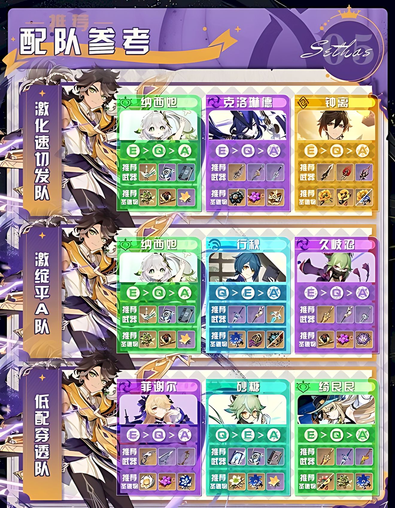 4、配队有三类实用组合,激化速切队搭配纳西妲克洛琳德钟离,激绽平A队适配纳西妲行秋久岐忍,低配队可选菲谢尔砂糖绮良良。