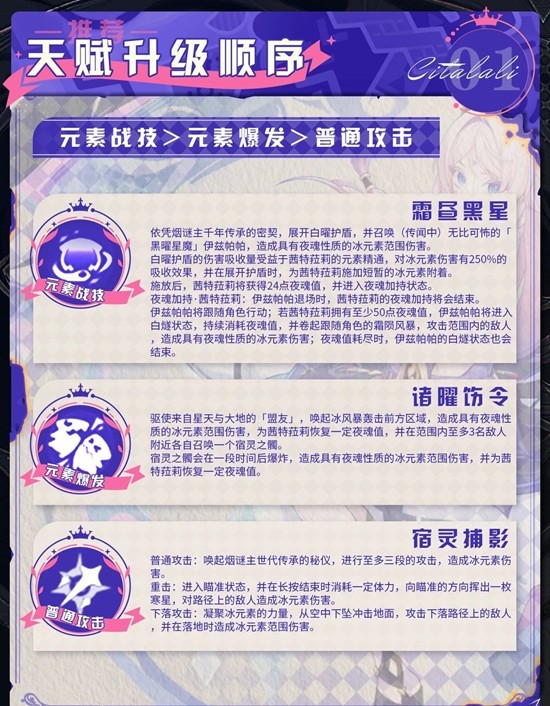2、天赋升级按元素战技优先元素爆发其次普通攻击的顺序,元素战技提供核心护盾与伤害,元素爆发召唤宿灵增强输出能力。