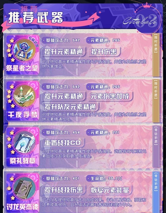 3、推荐武器有祭星者之望千夜浮梦等,祭礼残章可刷新战技冷却,讨龙英杰谭培养成本低且能为队友提供攻击力加成。