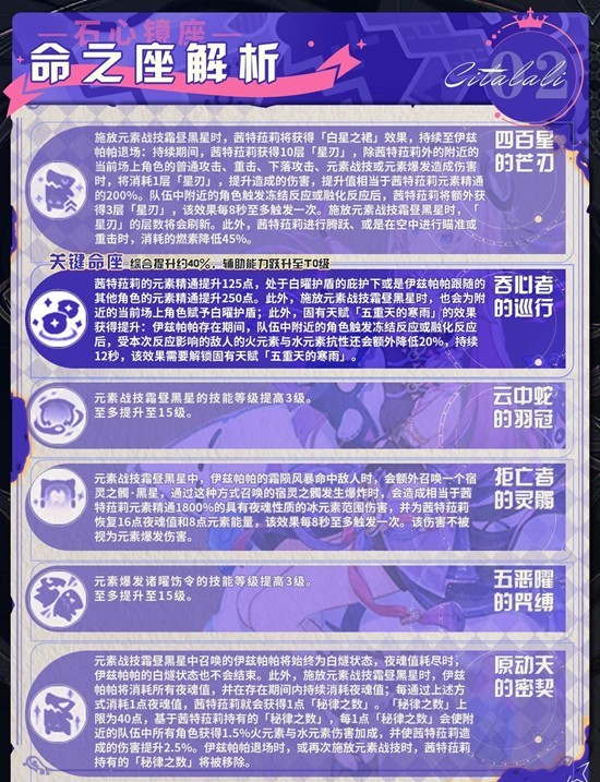 1、角色定位清晰,为冰元素辅助,突破提升115点元素精通,元素战技可展开护盾召唤伙伴,元素爆发能造成范围伤害并恢复夜魂值。