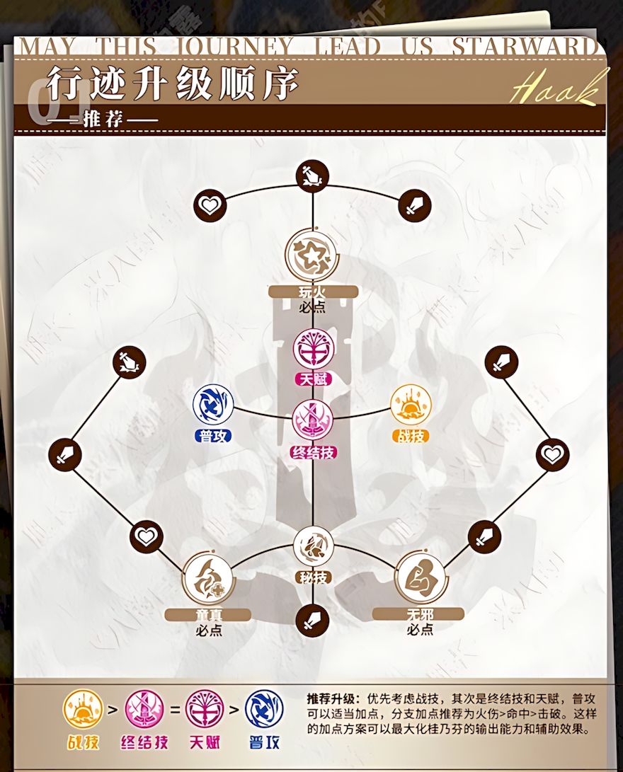 1、行迹升级按战技终结技天赋普攻顺序,战技推荐升满十级,终结技与天赋升至八级,普攻一级即可,分支加点火伤命中击破依次排序。