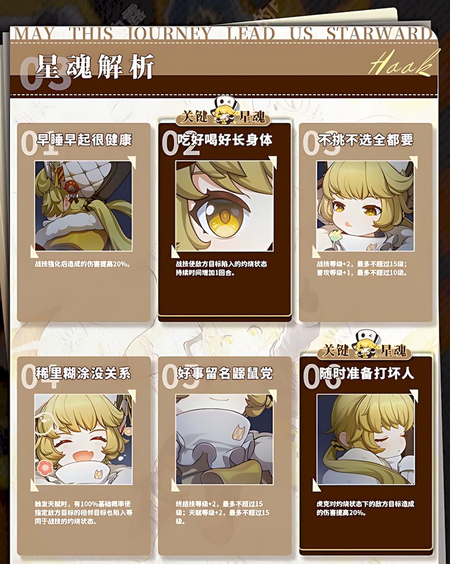 2、星魂核心解锁二四六星魂,二星魂提升战技伤害延长灼烧时间,四星魂触发天赋时扩散灼烧,六星魂提高灼烧目标伤害并升级技能。
