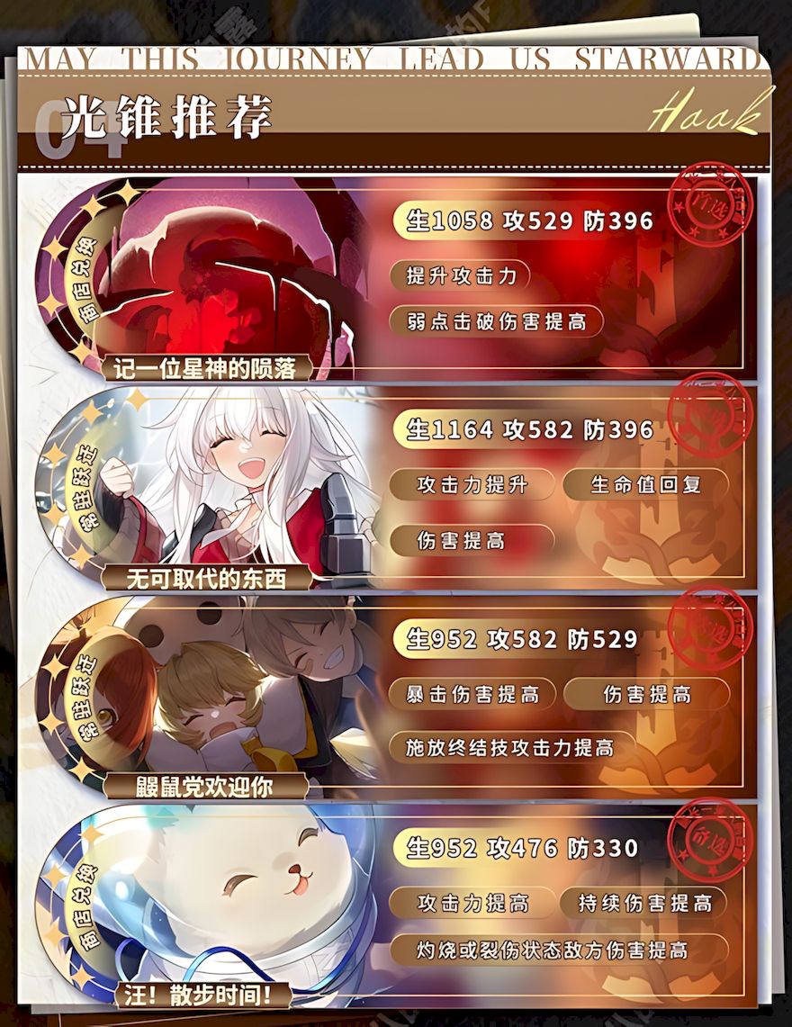 3、光锥选择侧重攻击力暴击伤害或持续伤害提升,可选记一位星神的陨落无可取代的东西等适配输出需求的装备。