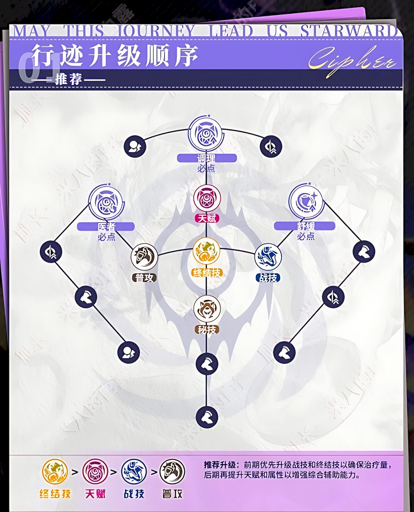 1、行迹升级需分阶段推进,前期优先提升战技和终结技保障治疗量,后期再强化天赋和属性,普攻推荐一级战技六级终结技十级天赋八级。