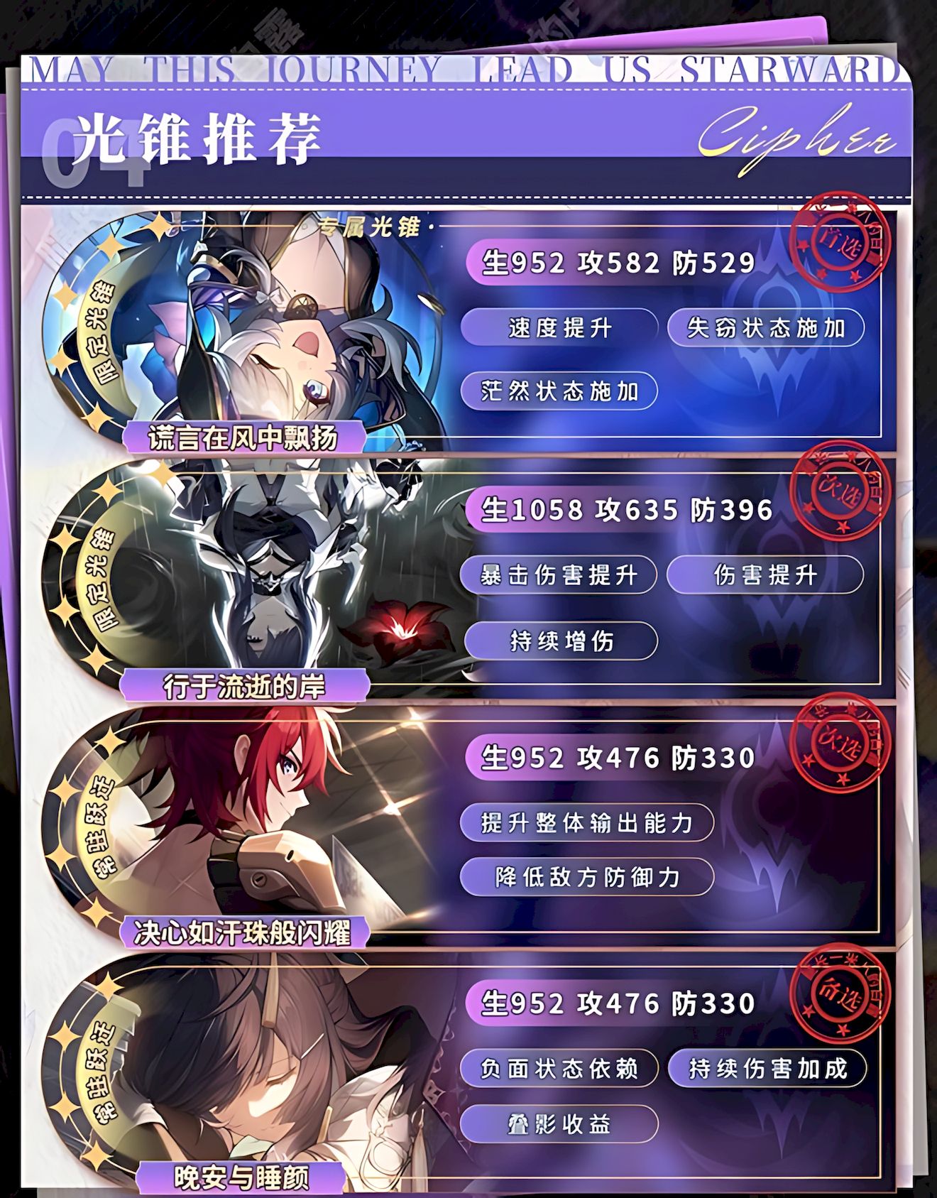 4、光锥推荐专属款优先,次选多款适配类型,遗器可选两套不同套装,分别提升负面状态下伤害暴击属性或能量恢复效率与队友攻击。