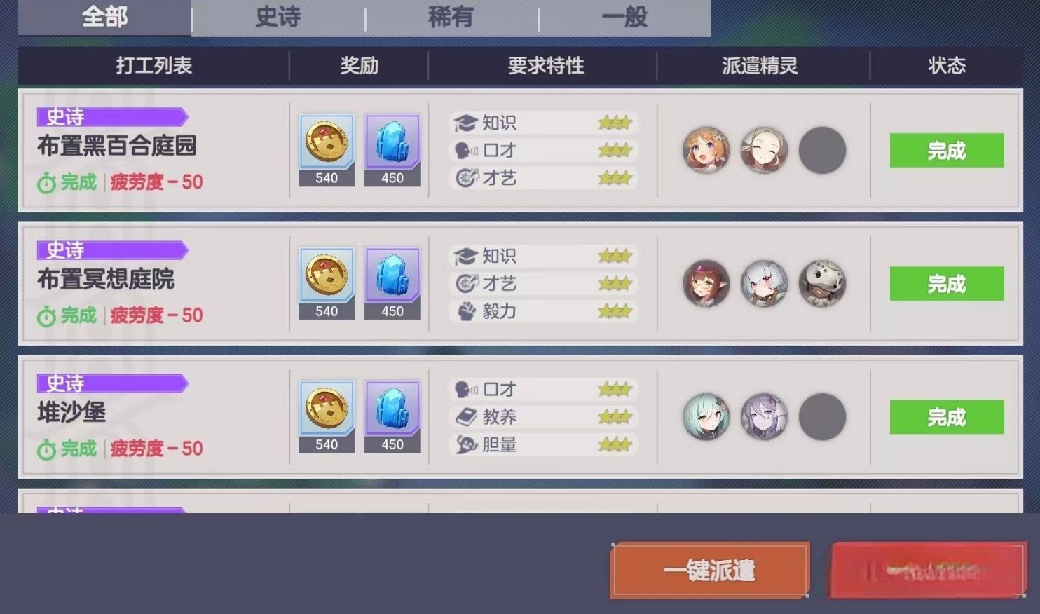 3、精灵委派需指派精灵执行委托,任务分三级单次疲劳消耗恒定,优先选择史诗及含限定道具的稀有任务,精灵疲劳满值需移入休息栏恢复。