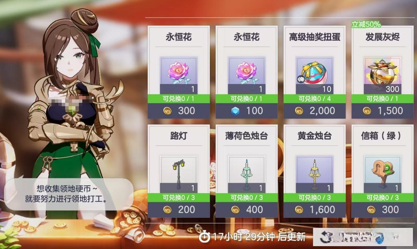 4、领地硬币兑换需遵循优先级,首选永恒花与扭蛋球,其次是发展灰烬,满足前序需求后再兑换建筑图纸等其他道具保障养成效率。