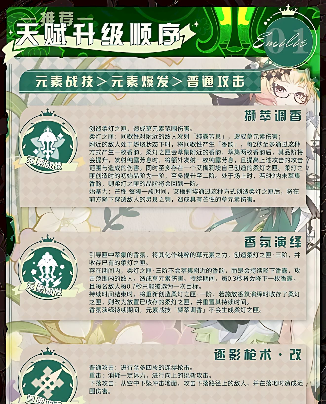 1、天赋升级明确,元素战技优先级最高,其次是元素爆发,普通攻击优先级最低,依此顺序升级可最大化输出效率。