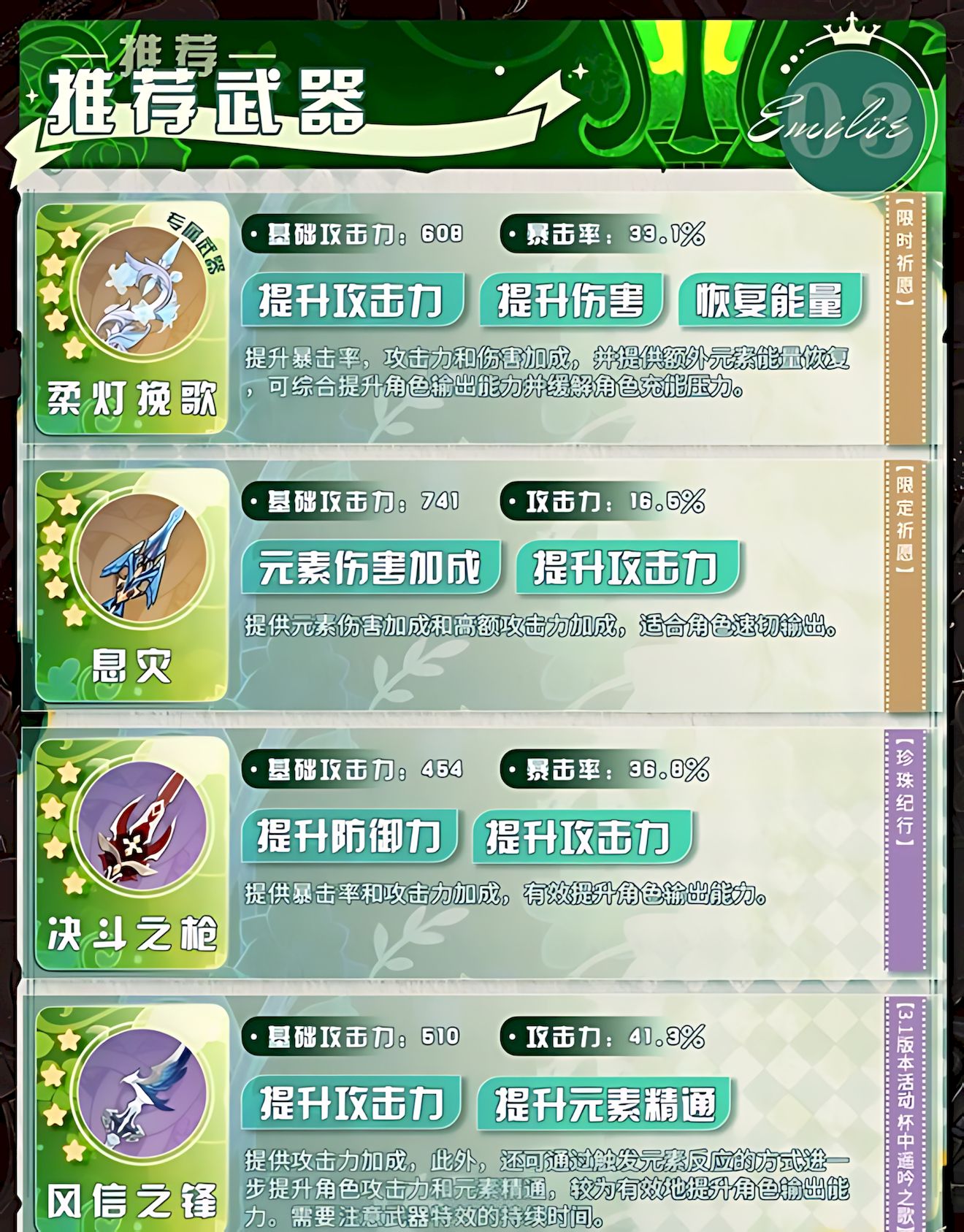 2、武器选择多样,专属武器能综合提升输出与充能,其他推荐武器分别侧重攻击力、暴击率或元素反应强化,适配不同需求。