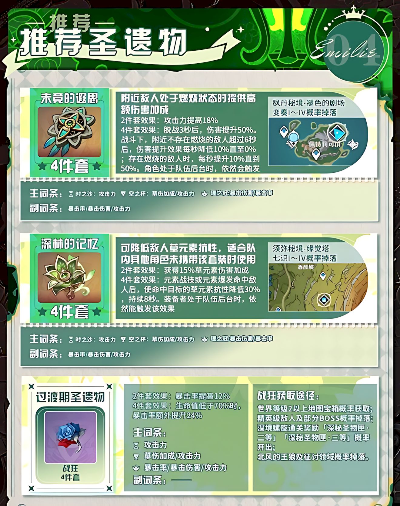 3、圣遗物有专属适配套装,可提供伤害加成或降低敌人草元素抗性,过渡期套装也能满足基础输出需求,主副词条侧重攻击与暴击属性。