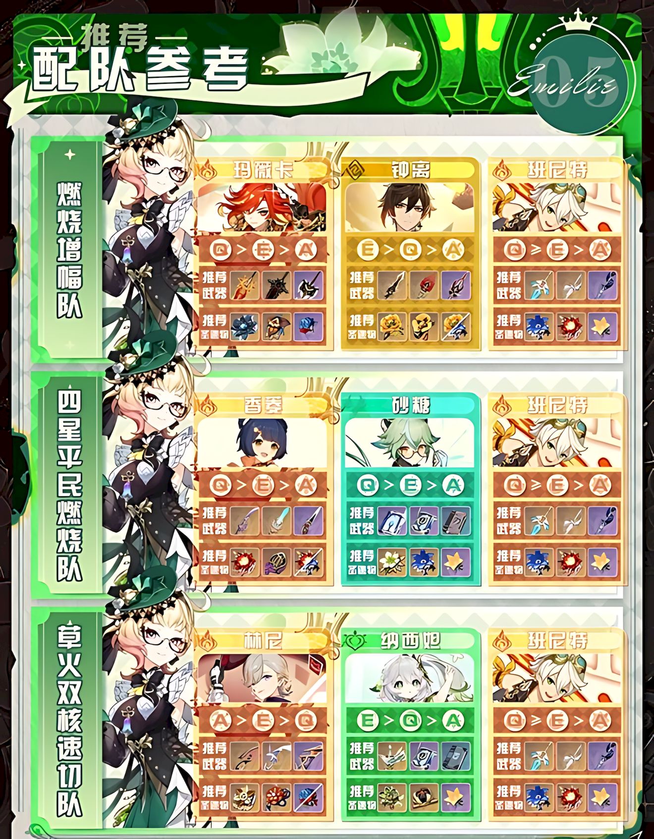 4、队伍搭配灵活,涵盖燃烧增幅、四星平民及草火双核速切等体系,通过与不同角色组合触发反应,强化整体战斗能力。