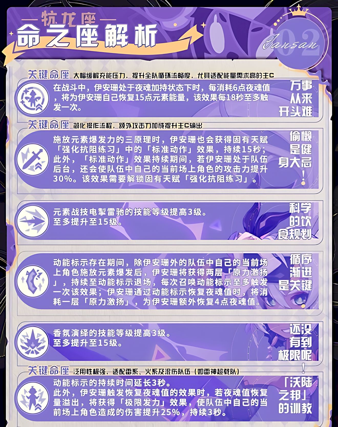 2、命座核心亮点集中在充能缓解增伤加成和机制优化,关键命座解锁后可显著改善循环流畅度,为不同类型队伍提供有力支援。