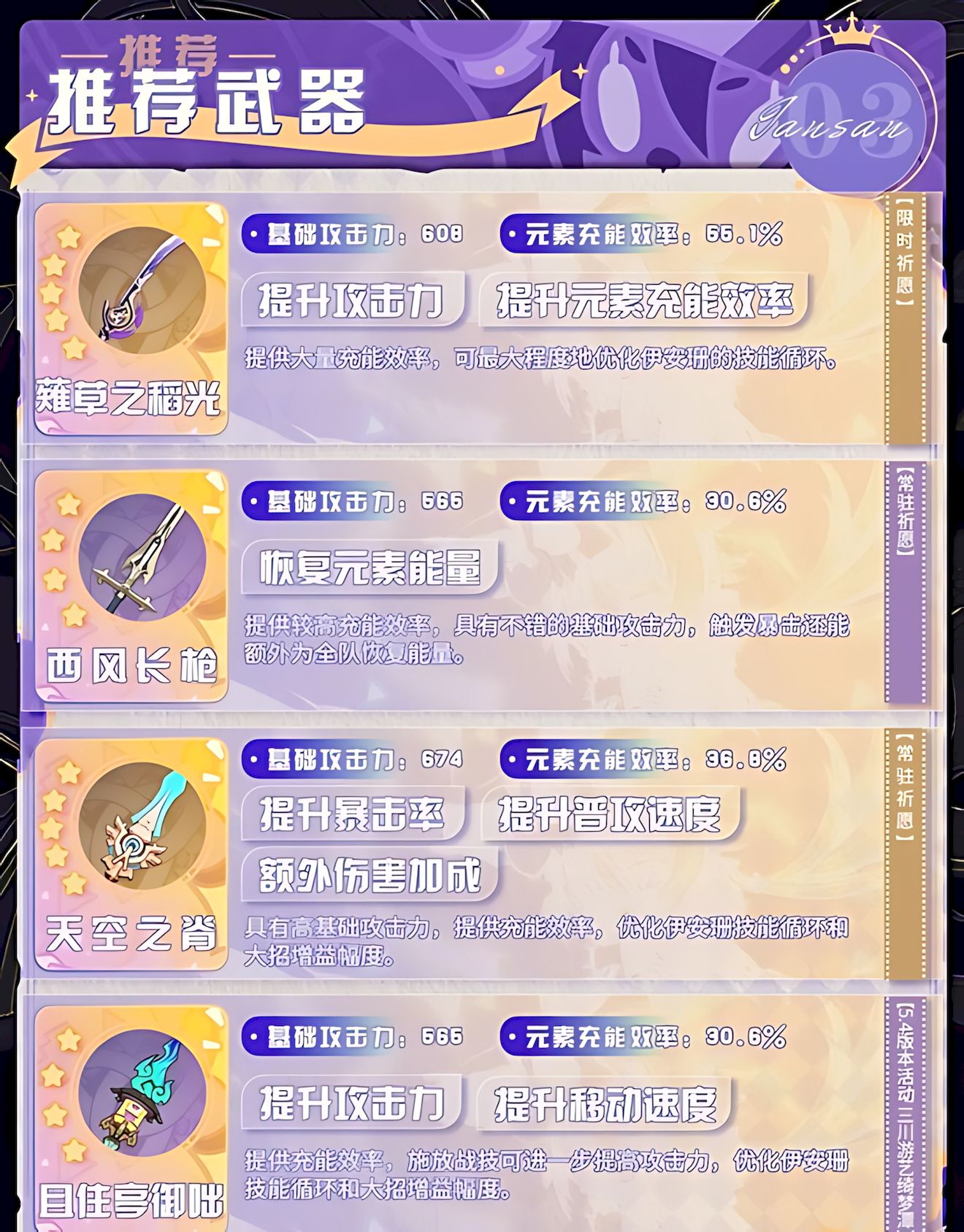 3、武器推荐薙草之稻光西风长枪等长柄武器,这些武器能补充充能效率或攻击力,契合角色辅助定位提升技能循环与增益效果。