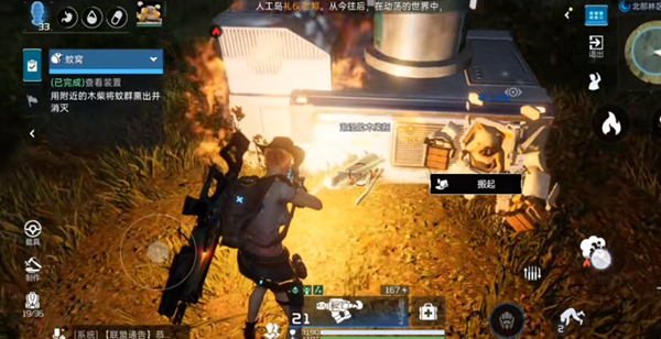 3、之后使用火元素枪把木柴点燃,把巨蚁熏出来。