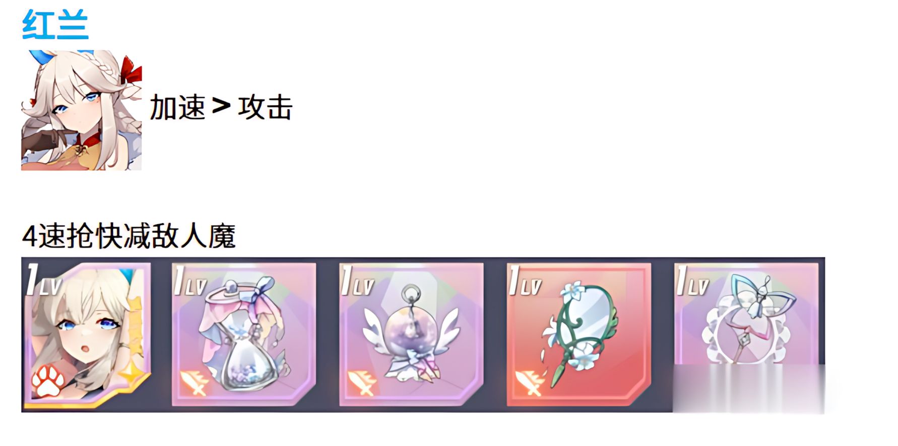1、红兰核心机制是快速削减敌方魔法值,配装优先速度确保首回合触发减魔,达标后叠加攻击力增强附带伤害。