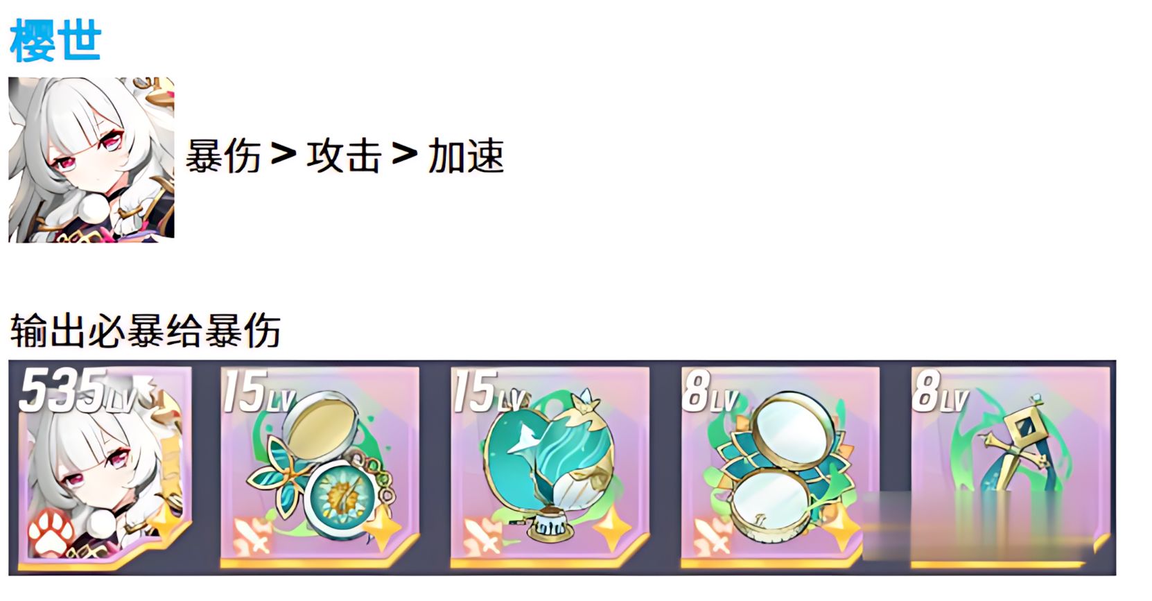 2、樱世作为标准输出单元,配装以暴击伤害为核心,其次为攻击力,速度仅作末位补充最大化技能倍率。