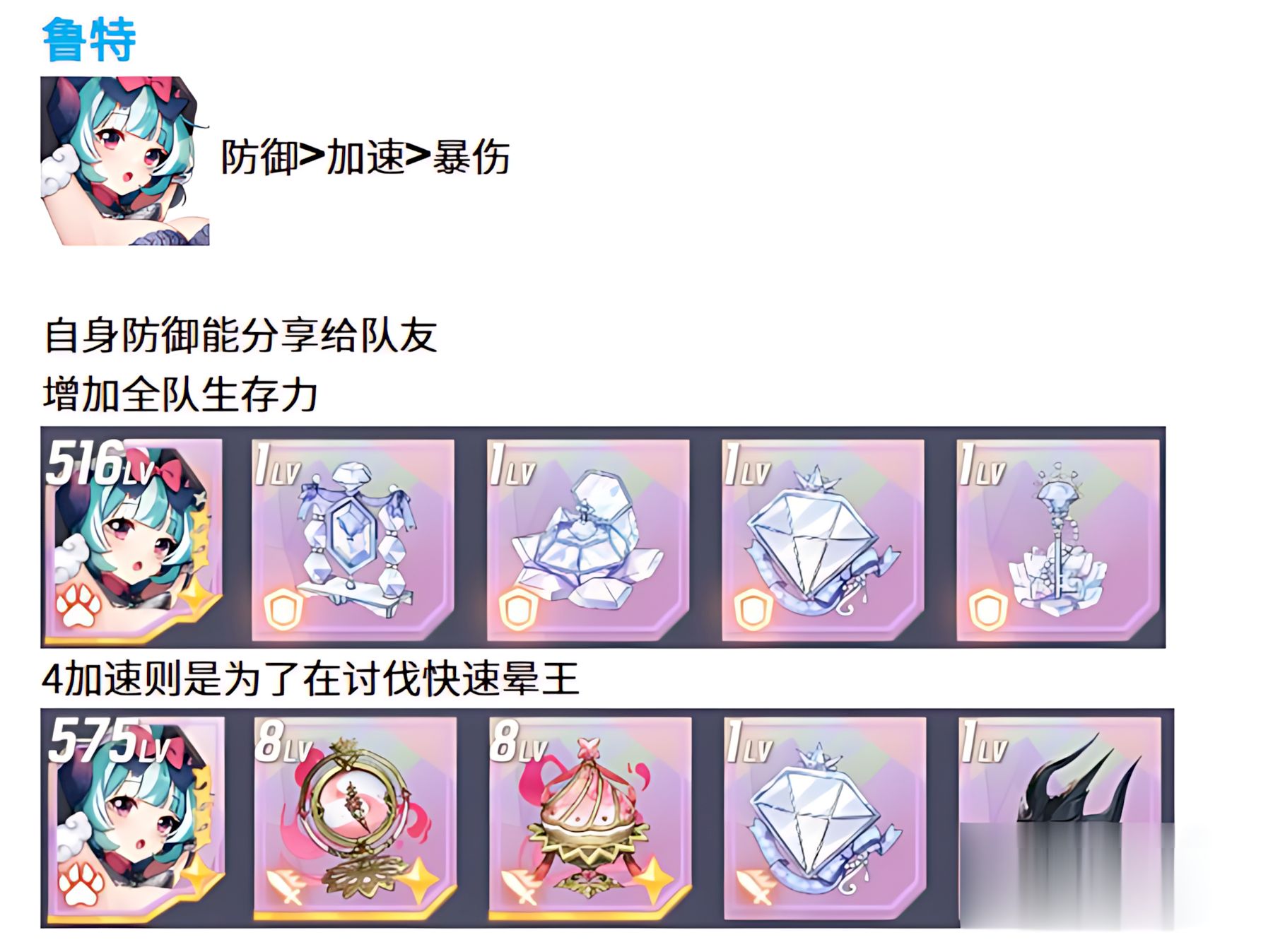 3、鲁特为防御联动型角色,天赋可共享防御给队友,配装优先防御,特定讨伐战需眩晕时临时调整速度。