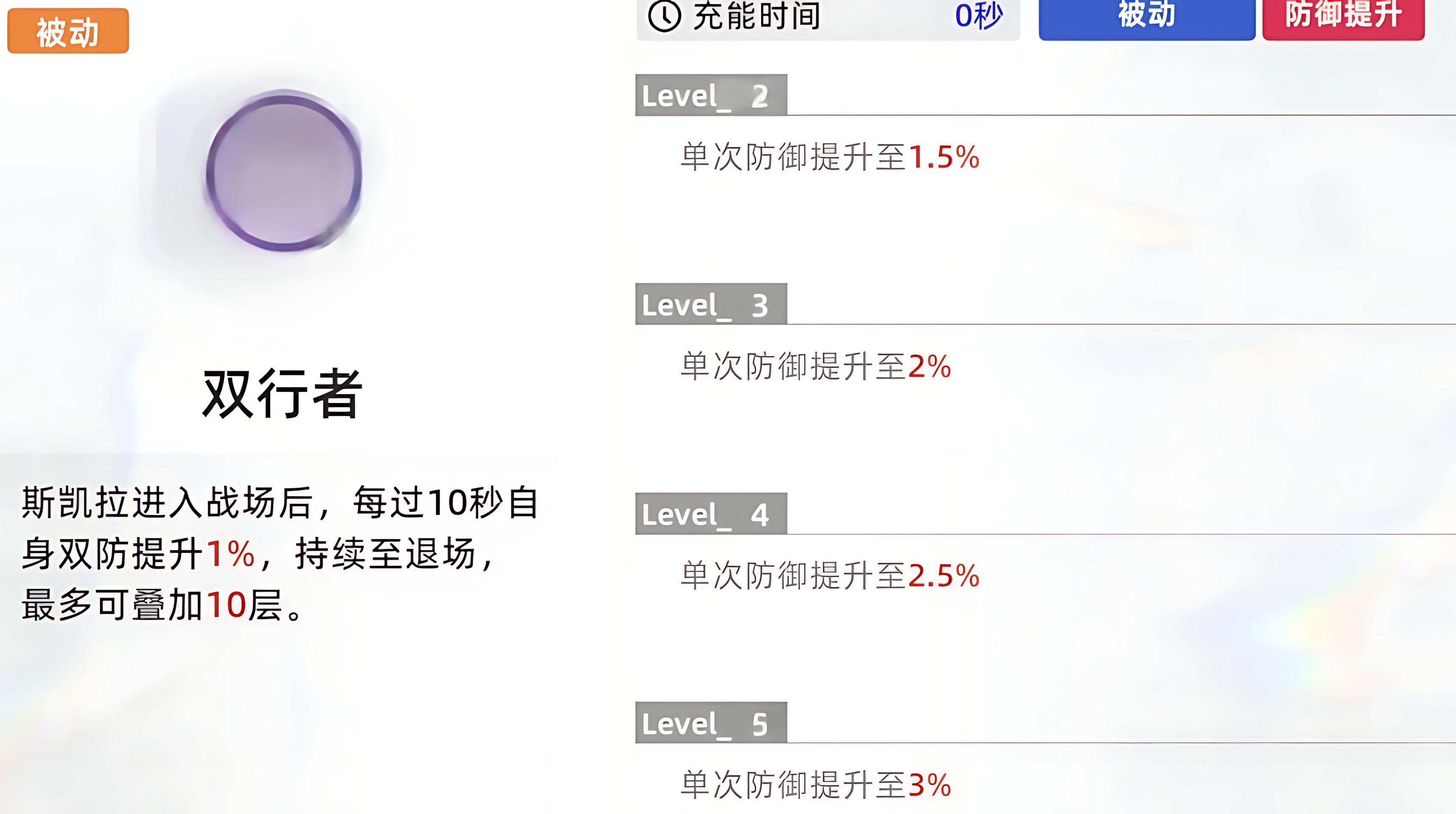 2、核心被动提供攻防加成,入战每10秒提升1%双防最多叠10层,技能升级后单次提升最高3%,长线战斗中生存能力持续增强。