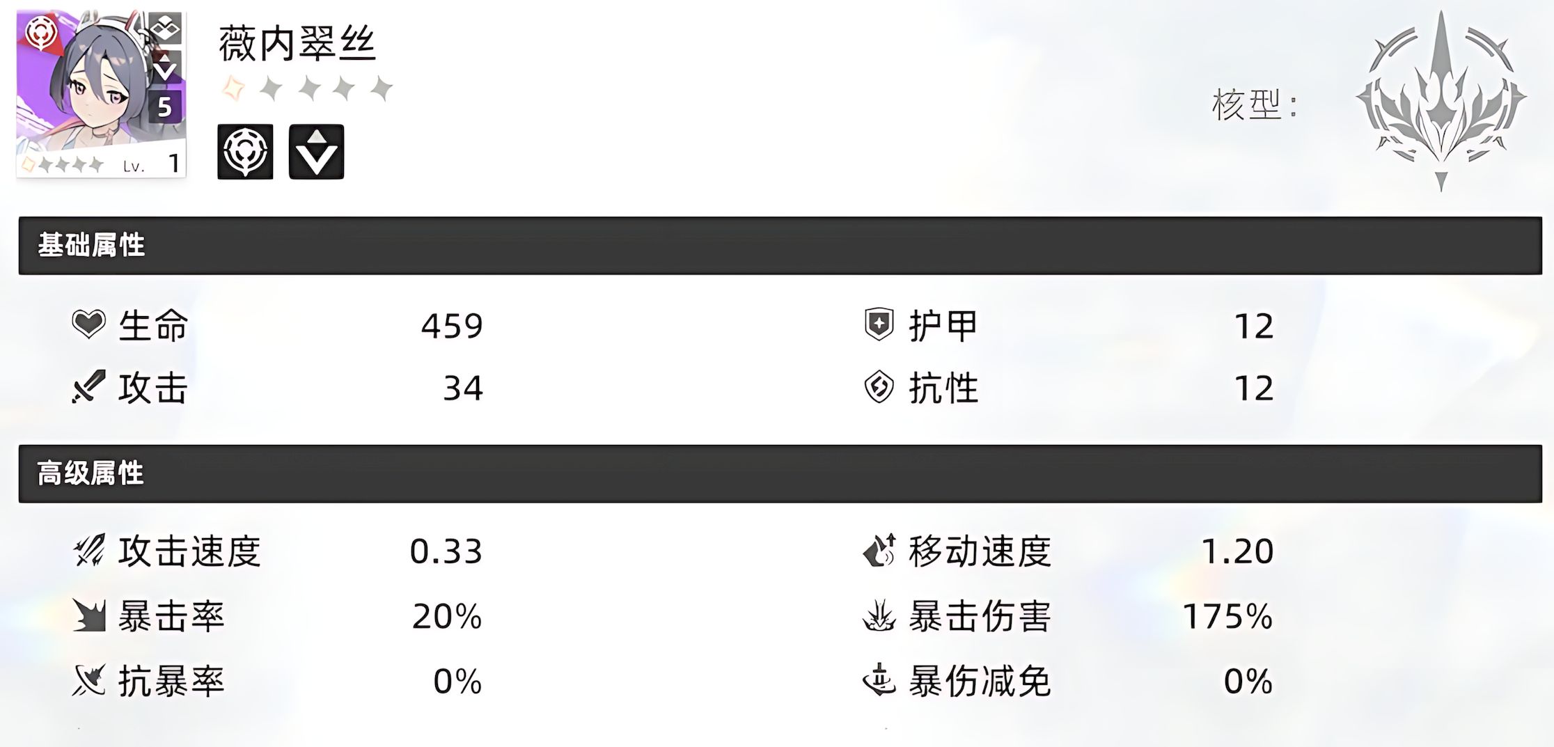 1、角色为SR品级终结类型,地面型可对地攻击,基础血量超3000攻击力200多,护甲抗性中等,高级属性含20%暴击率与175%暴击伤害。