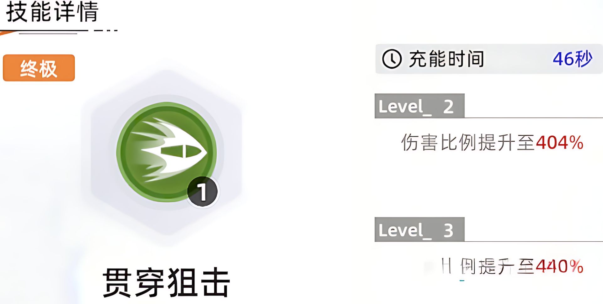 2、普攻用重型狙击枪打击单体造成高额物伤,特技发射3枚狙击弹,两种攻击升级后均能提升伤害倍率,输出能力随等级逐步强化。