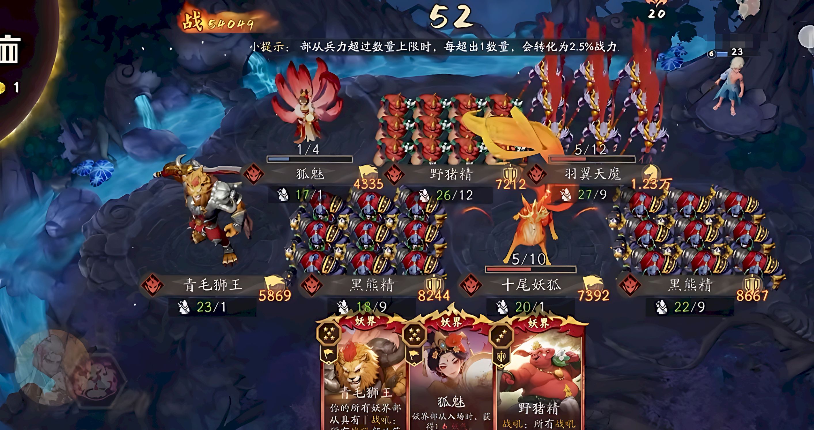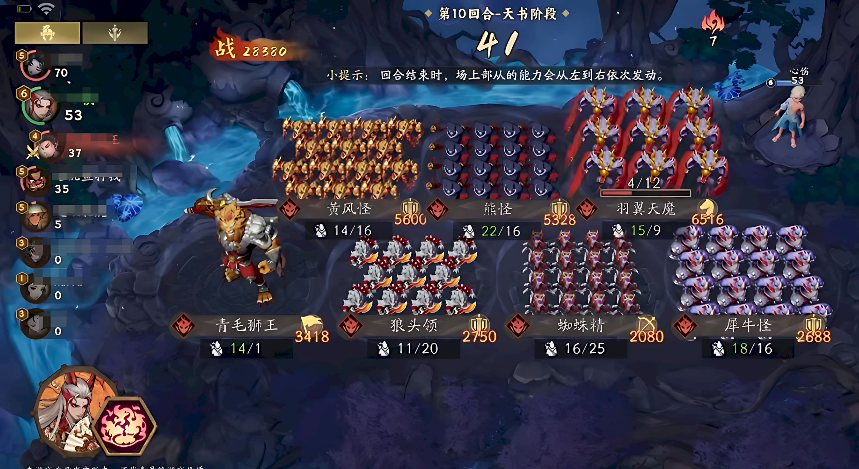 2、开局选夜游神、侍女幽魂、双剑骷髅兵作为初始兵力,避免前期承伤过重,为四回合爆发预留空间,天书五级进入主力成型期,筹备五星部将。