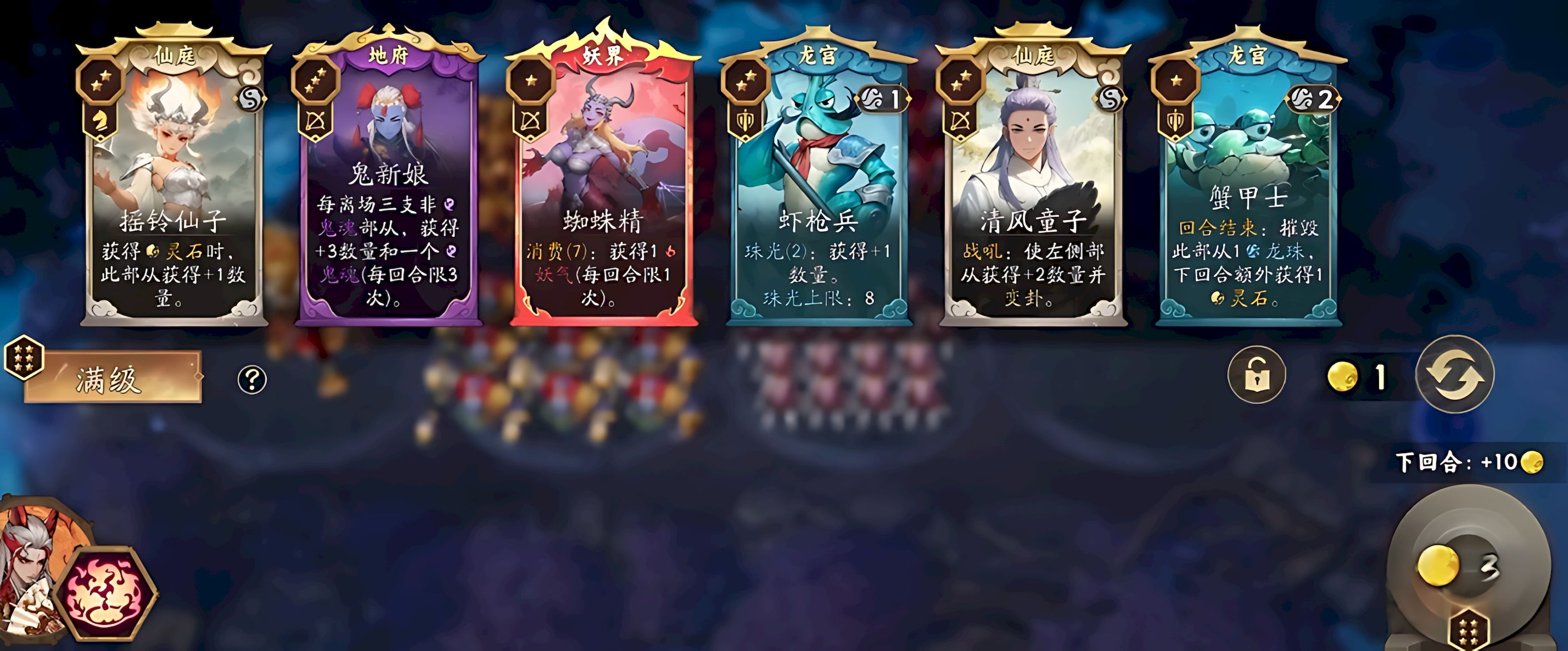 4、前四回合需让小鬼总数突破一百只,完成阎罗进化,天书升至六级,解锁高阶协同加成与瘴气上限,提升中后期续航能力。