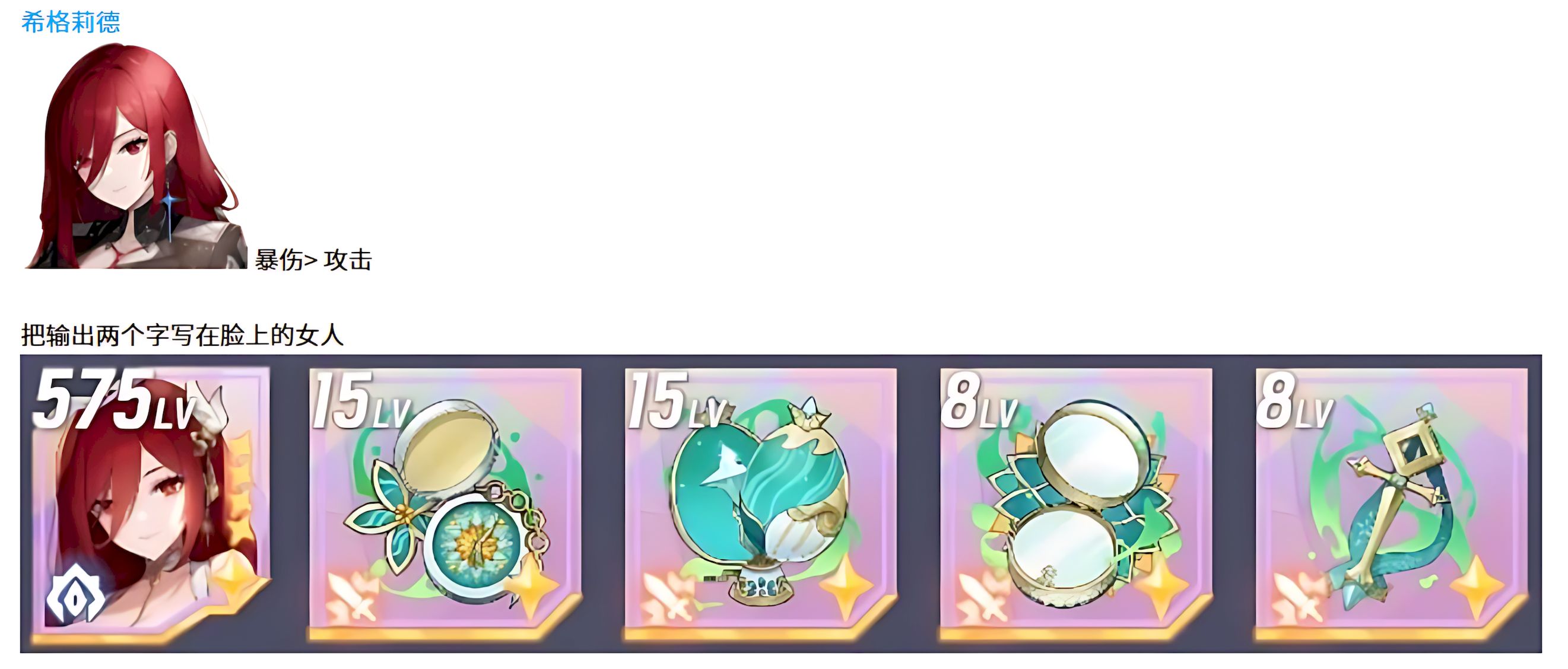 1、希格莉德定位纯输出,配装首选暴击伤害其次考虑攻击力,无需平衡各类属性,需把伤害拉到极限,这样才能满足上场秒人需求发挥应有作用。
