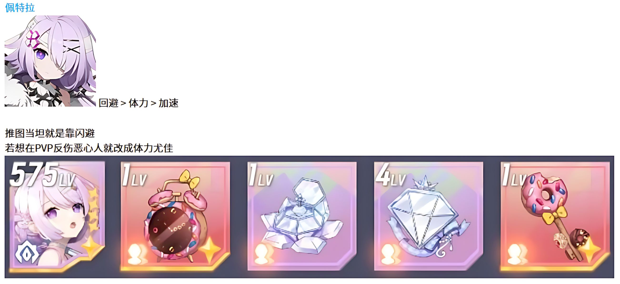 2、佩特拉承担坦克职责,配装优先回避属性,体力排在第二位,加速属性也不能忽视,竞技场使用需优先堆高体力,依靠反伤机制消耗敌方血量。