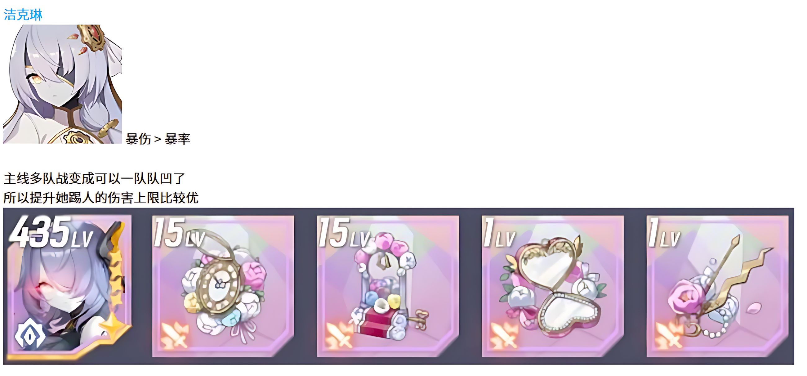 3、洁克琳玩法特殊踢人技能实用,配装需拉满暴击伤害,暴击率稍微补充即可,提升单次伤害上限,关键时刻能将敌人踢出场为队伍腾出空间。