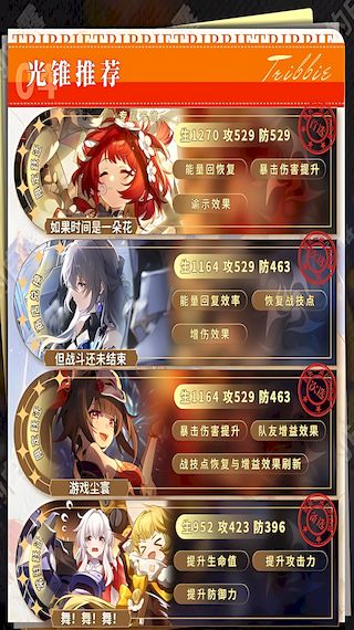 2、光锥首选专属如果时间是一朵花,次选但战斗还未结束,四星可择游戏尘寰或舞舞舞,按需挑选就能满足不同养成成本下的辅助需求。