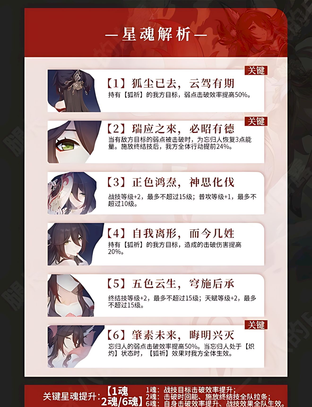 4、星魂优先补1魂提升战技目标击破效率,再补2魂实现击破回能与终结技全队拉条,6魂能提升自身击破效率且战技效果全队生效。