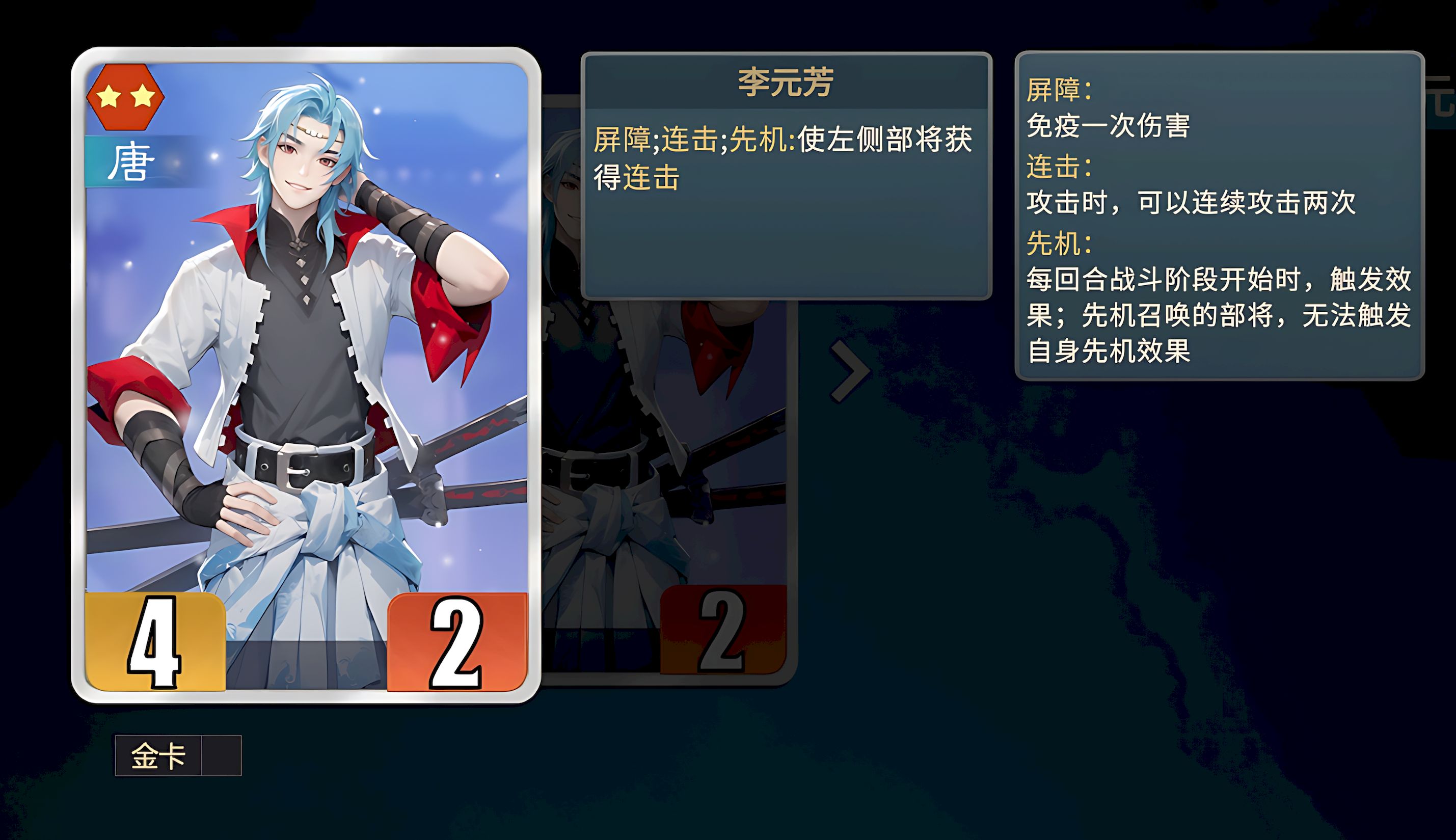 1、李元芳是拥有屏障连击先机三种机制的二星部将,开局阶段就能轻松获取,先机能力登场给左侧部将加连击,是主输出部将合格挂件助力收割敌人。