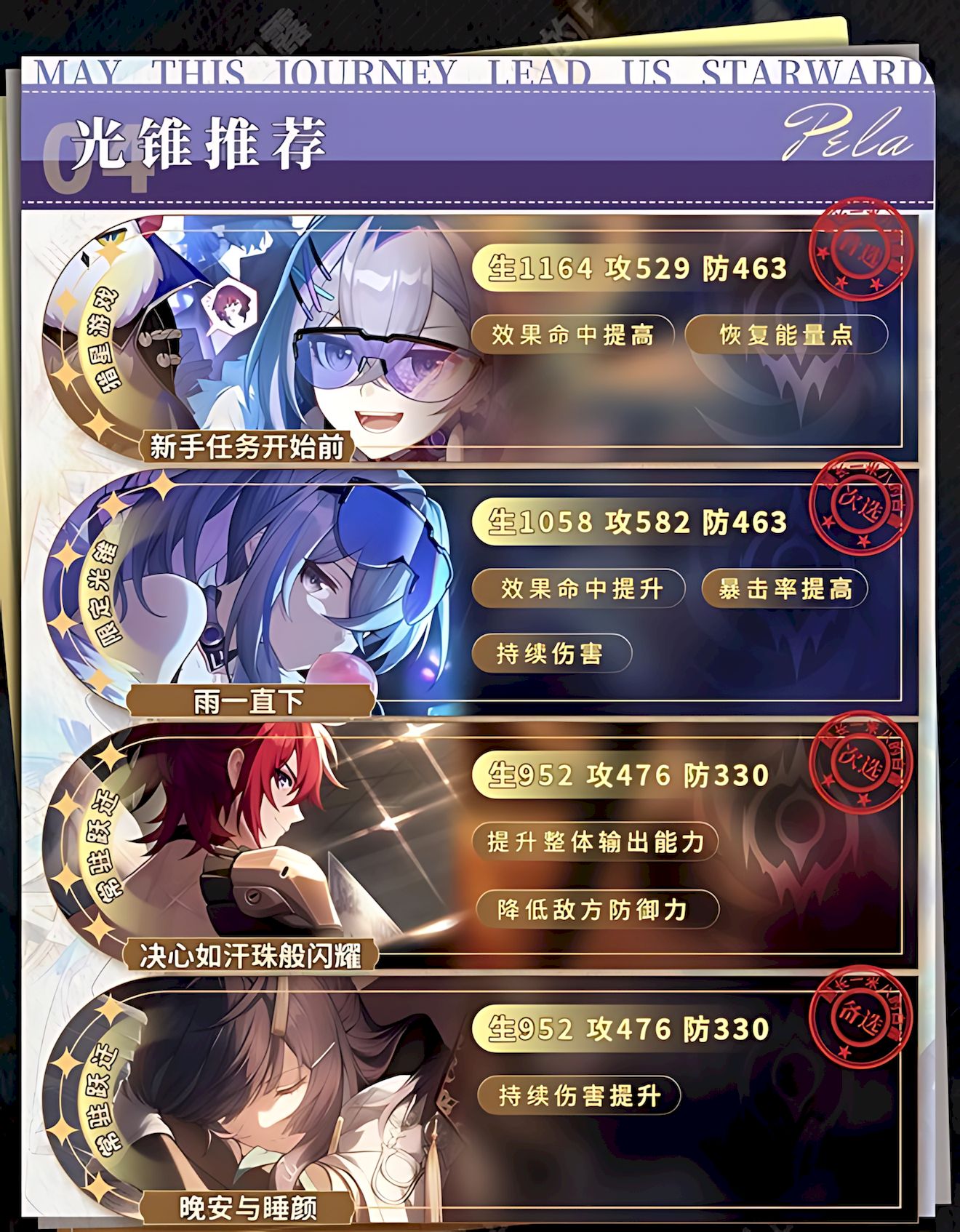 4、光锥推荐四类选择,专属优选雨一直下,还可搭配晚安与睡颜,决心如汗珠般闪耀,新手阶段可先用新手任务开始前过渡使用。