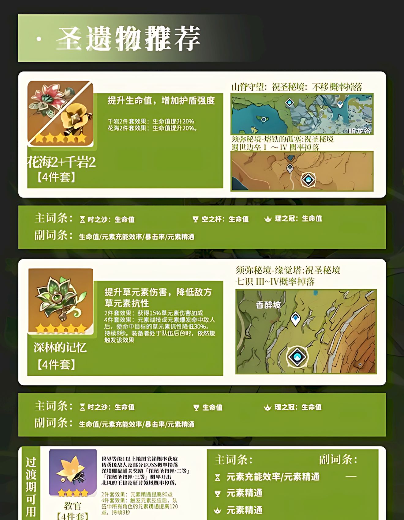 2、圣遗物推荐千岩2加花海2或深林4,过渡用教官4,主词条统一选择生命沙,生命杯,生命头。