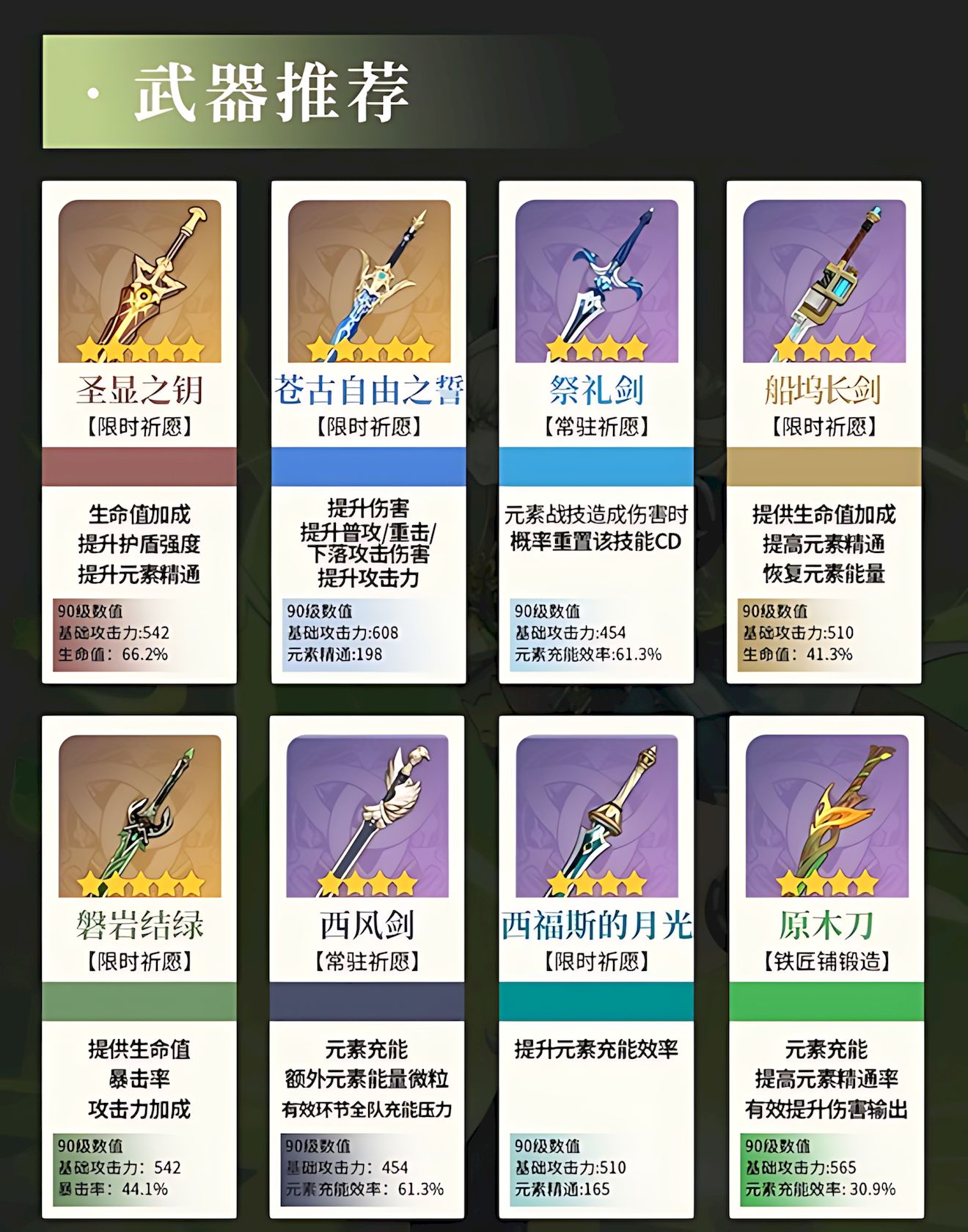 3、五星武器可选圣显之钥,苍古自由之誓,磐岩结绿,四星适合祭礼剑,西风剑,西福斯的月光。