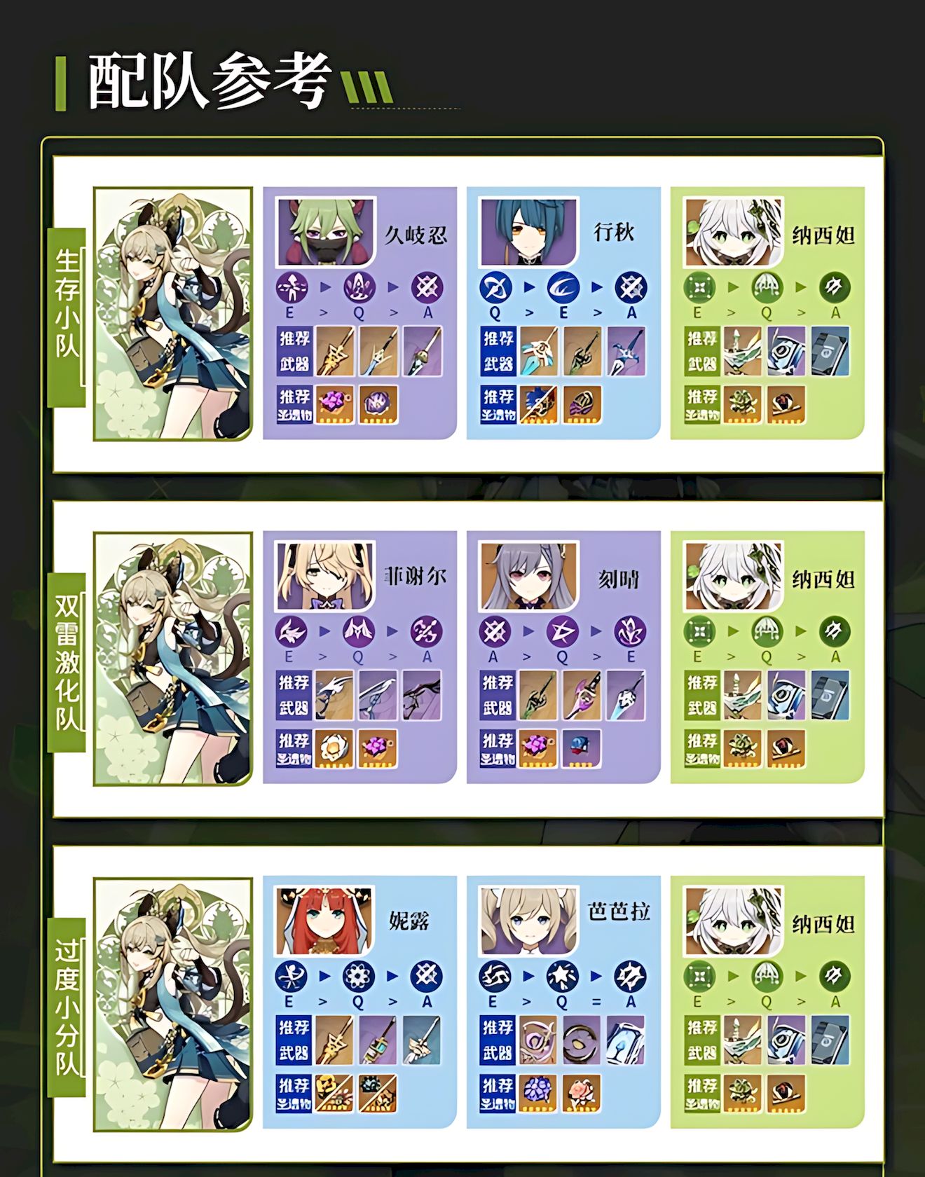4、配队可组绮良良,久岐忍,行秋,纳西妲,或菲谢尔,刻晴,纳西妲,也能搭妮露,芭芭拉,纳西妲过渡。