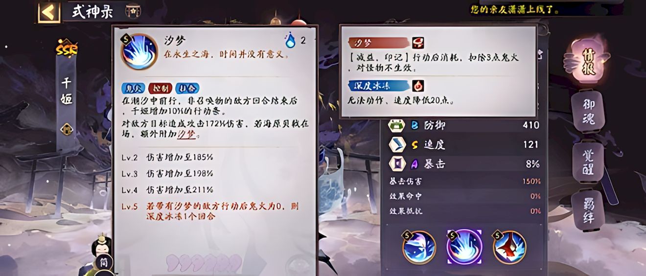 2、二技能需朝指定敌方式神释放,目标完成行动步骤结束后,会被扣除三点鬼火,敌方鬼火数值降至零时会触发深度冻结效果。