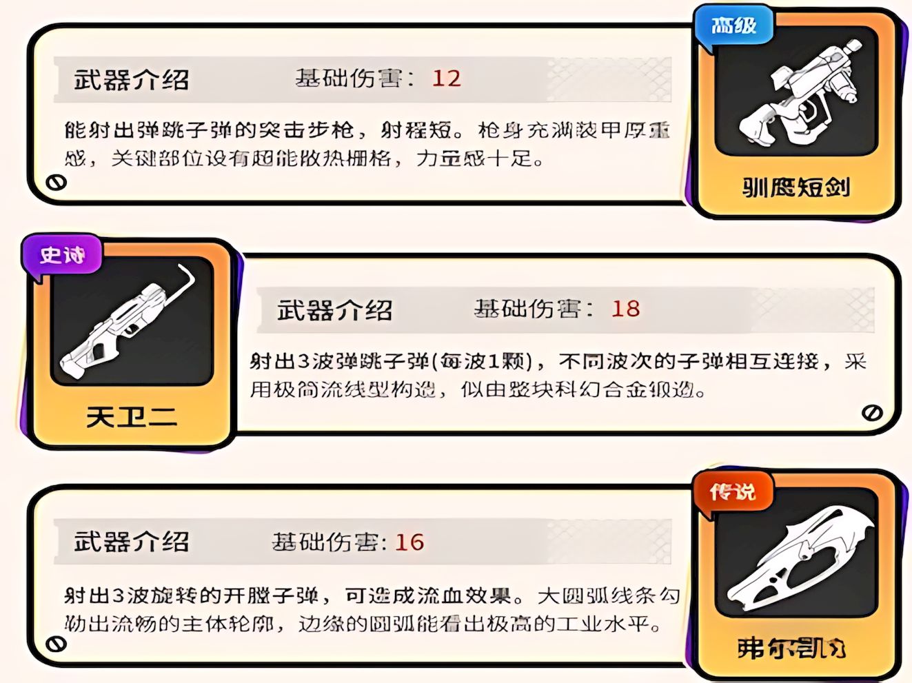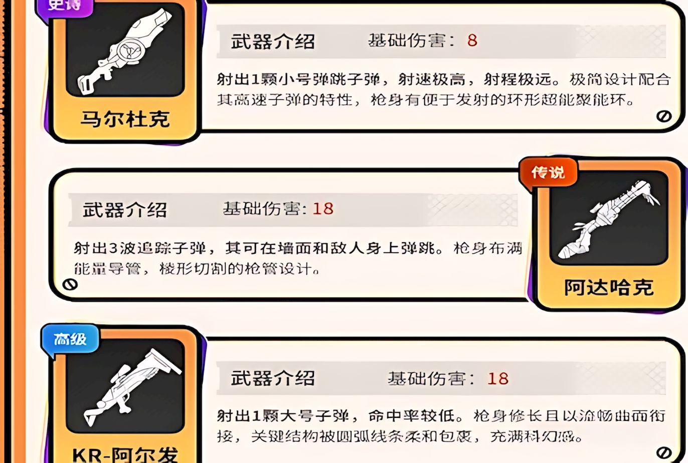 2、入门优先巨浪三连发设计命中率稳,阿达哈克爆发高适合高风险打法,阿尔法弹跳子弹适合中后期多变地形。