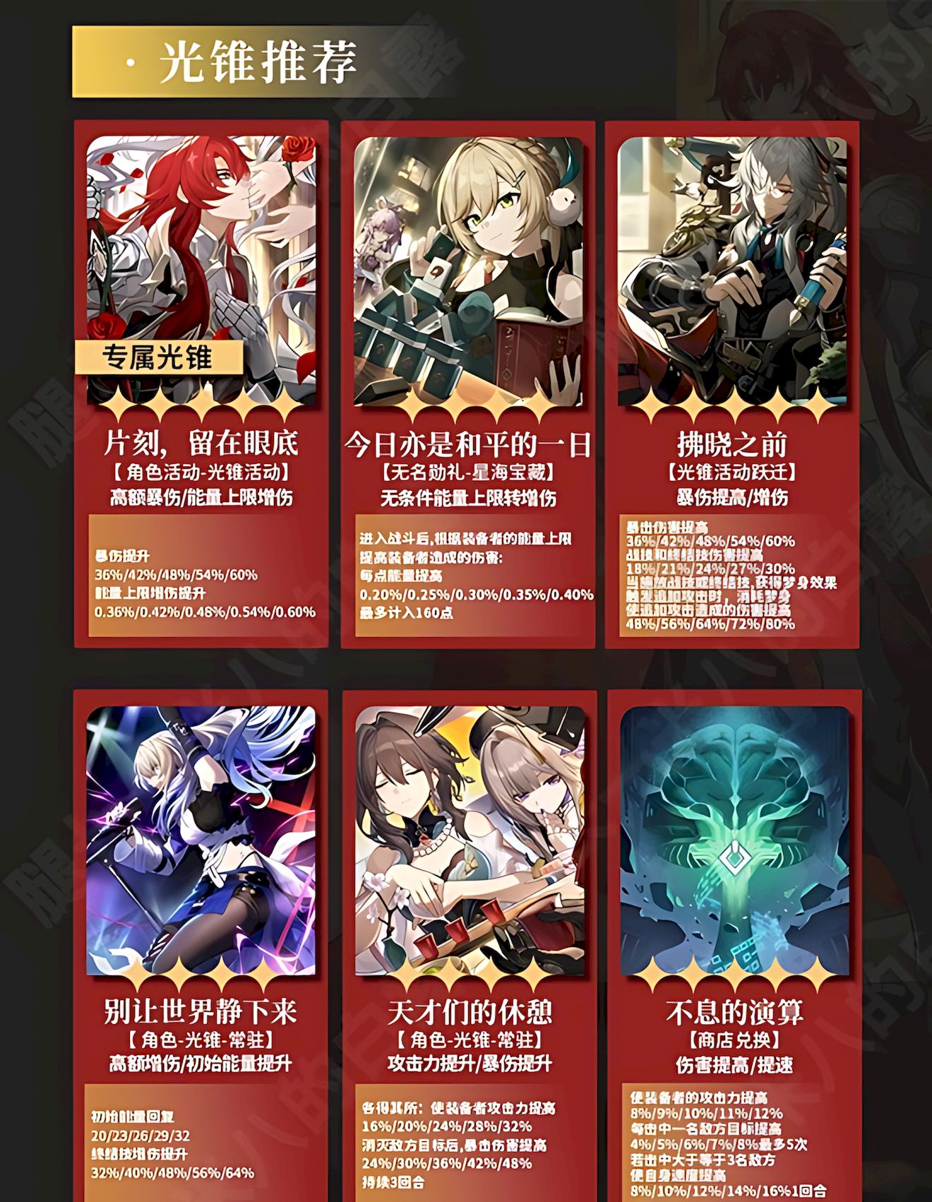 2、光锥选择,优先选用专属光锥,无专属可换拂晓之前或不息的演算,四星可选今日亦是和平的一日,保障输出与能量循环流畅度。