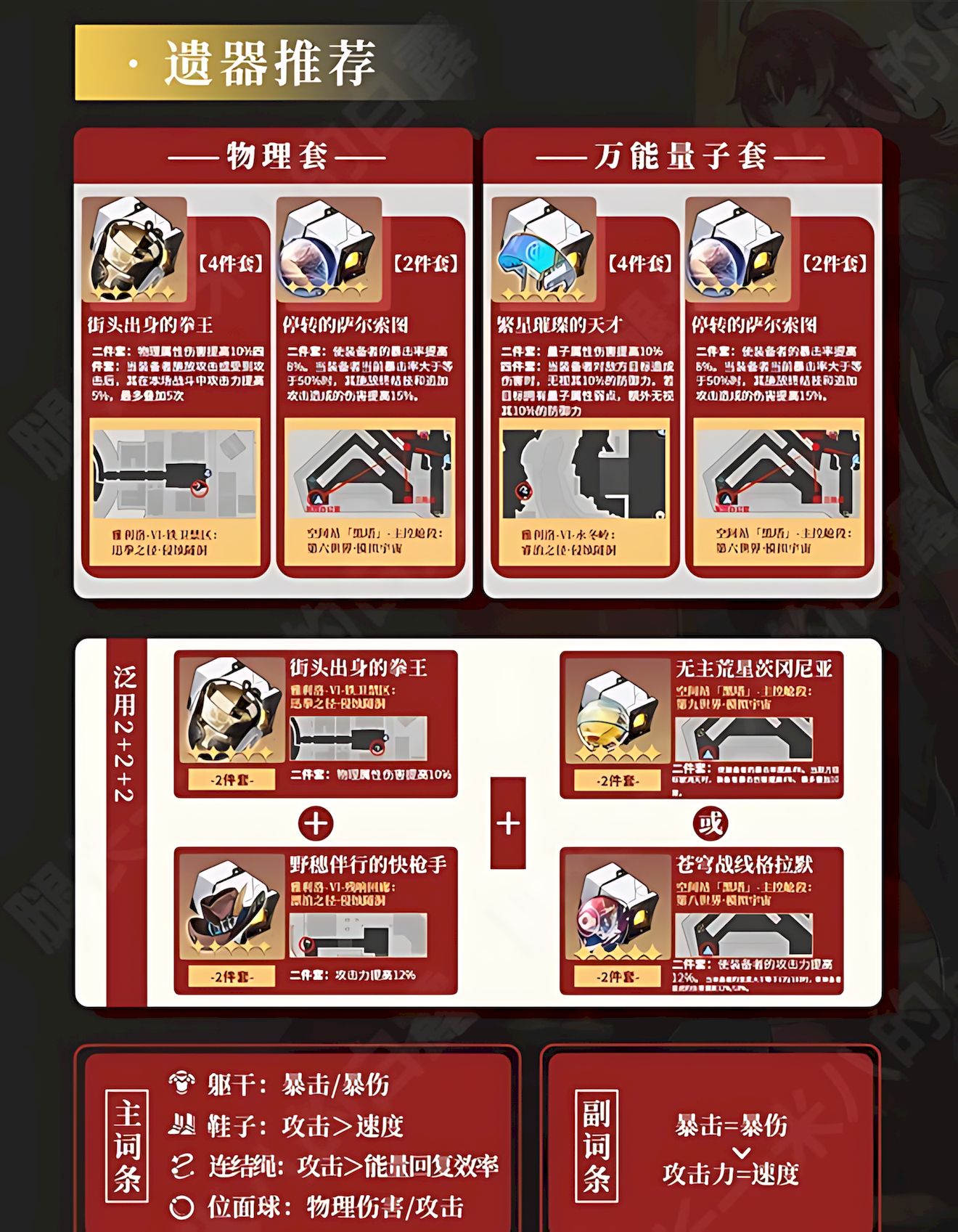 3、遗器搭配,首选街头出身的拳王四加停转的萨尔索图二,次选繁星璀璨的天才四加停转的萨尔索图二,堆叠物理增伤与暴击属性。