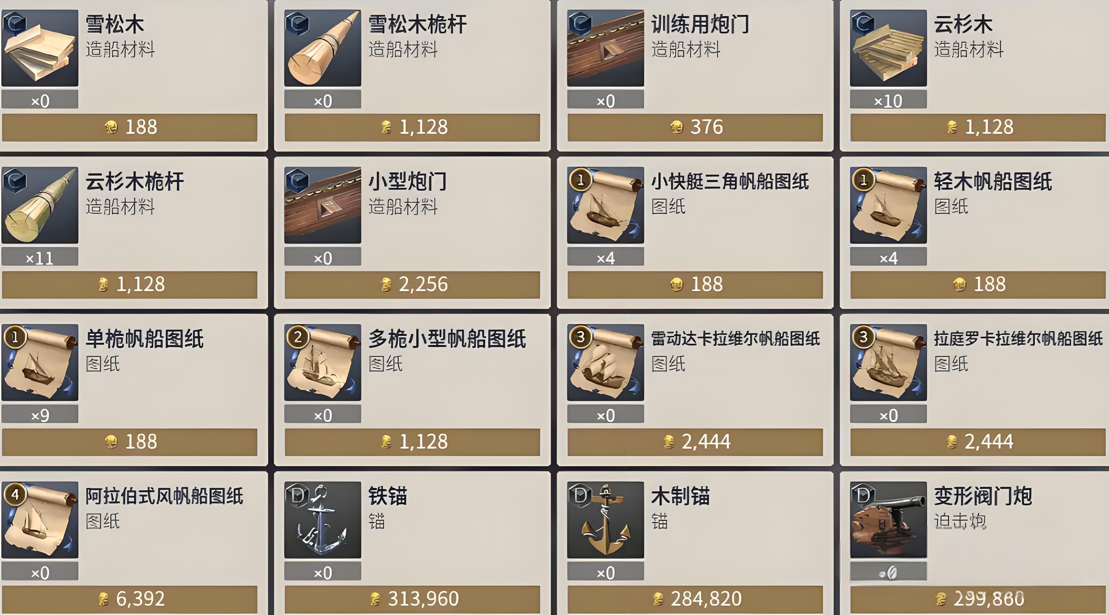 2、造船需基础材料与达克纳货币,材料含蓝图木材龙骨船桅炮口等,数量随船只规格变化,货币消耗包含建造关税。