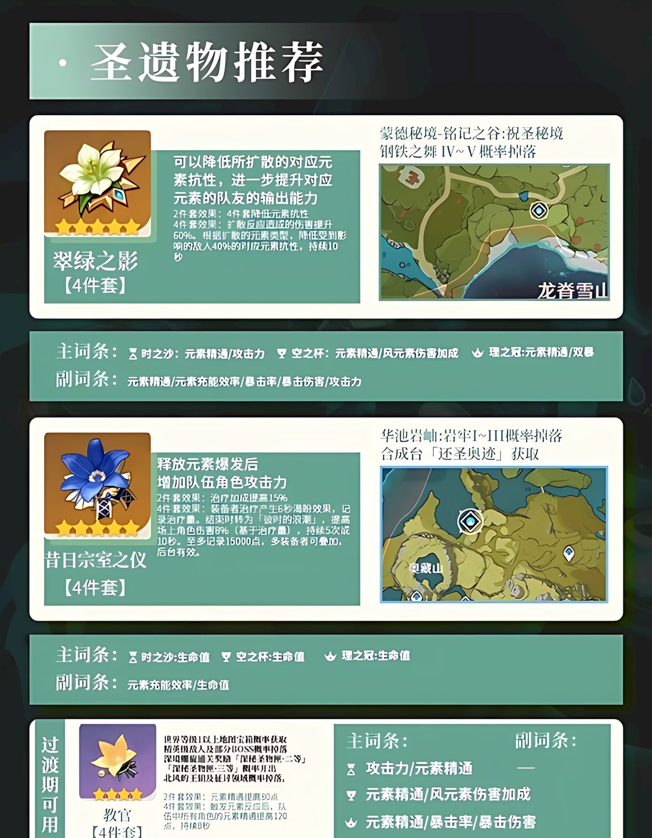 3、圣遗物核心选翠绿之影四件套,其次昔日宗室之仪,过渡期用教官四件套,主副词条侧重元素精通等。