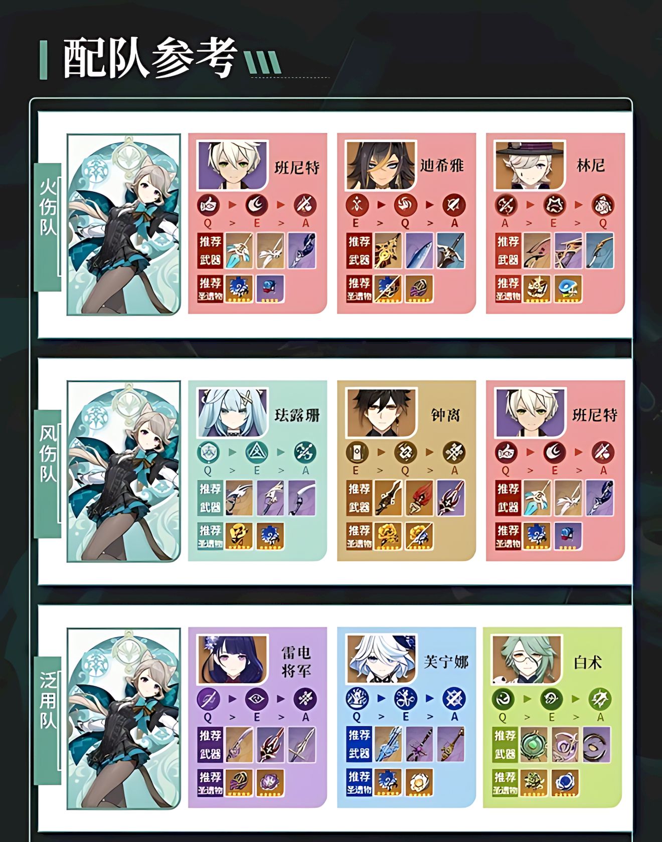 4、适合搭配火伤队风伤队及泛用队,与班尼特林尼珐露珊等角色组合,能发挥增伤辅助或输出双重作用。