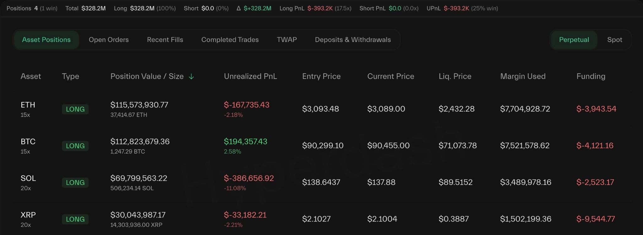 最新动作为3.28亿美元多头大单的组成部分,覆盖四大核心资产:价值1.128亿美元的1,247枚BTC;价值1.156亿美元的37,414枚ETH;价值6980万美元的503,778枚SOL以及1426万枚XRP。