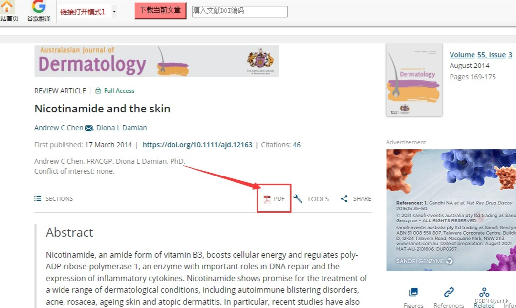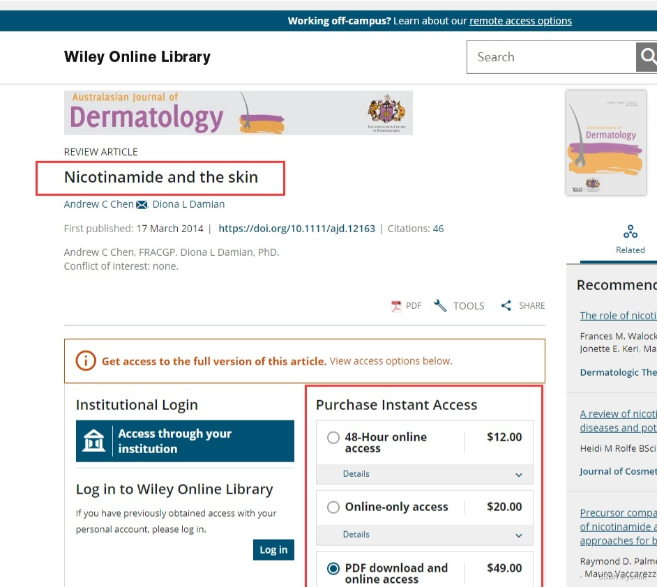 以收费文献"Nicotinamide and the skin"为例,通过识别文献来源数据库(如Wiley),转至对应平台完成下载: