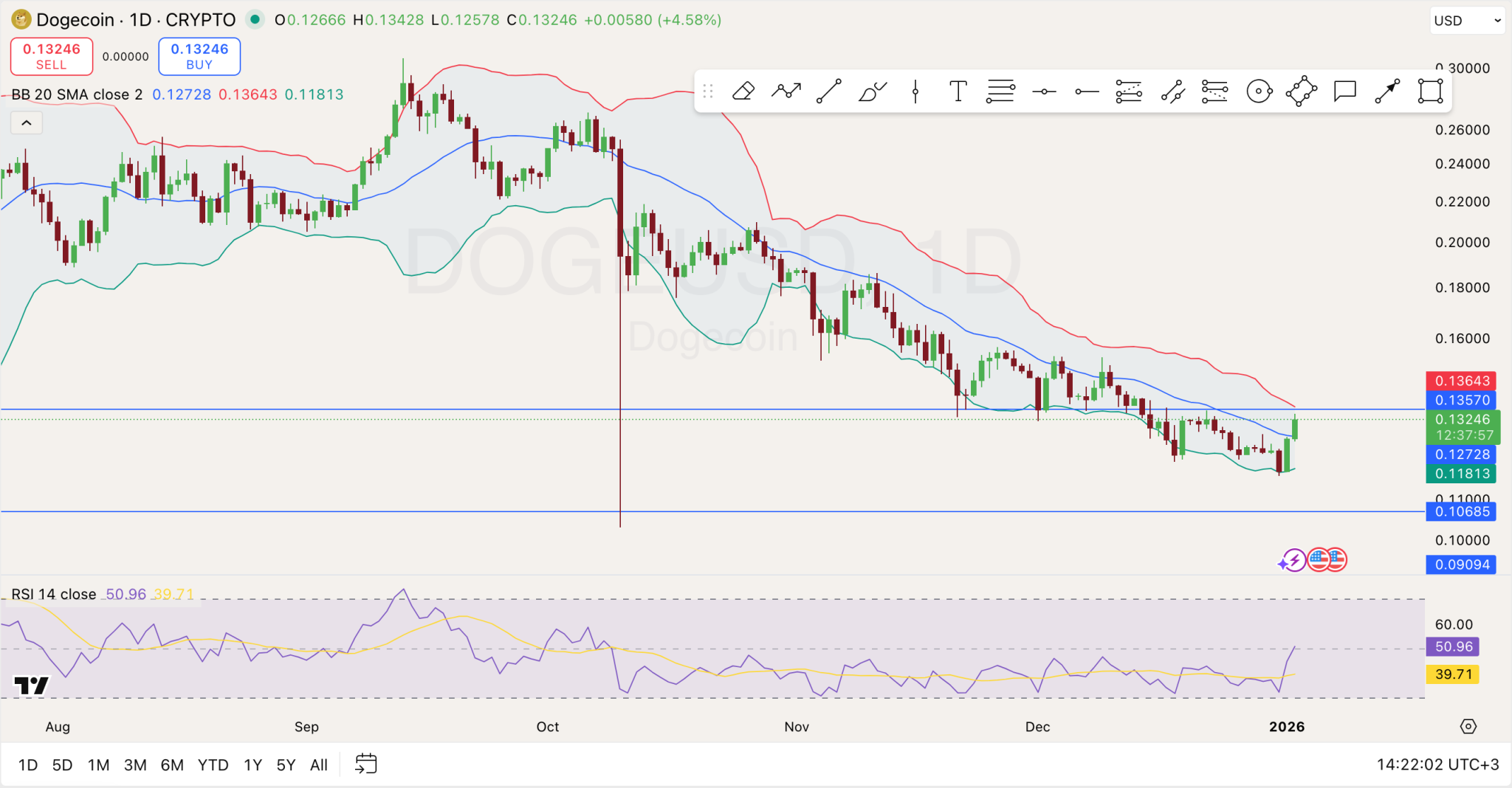 技术图表显示,狗狗币在长期下跌后正尝试短期复苏。日线图中DOGE重新站上0.127美元附近的中轨布林线(20日均线),这对多头而言是积极信号。