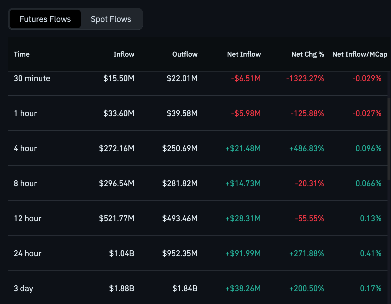 期货资金流数据显示短期承压但高阶周期情绪改善。过去30分钟和1小时分别录得651万美元和598万美元净流出,表明存在获利了结或交易者观望情绪。这种短期趋势反映市场对近期涨势的谨慎态度。