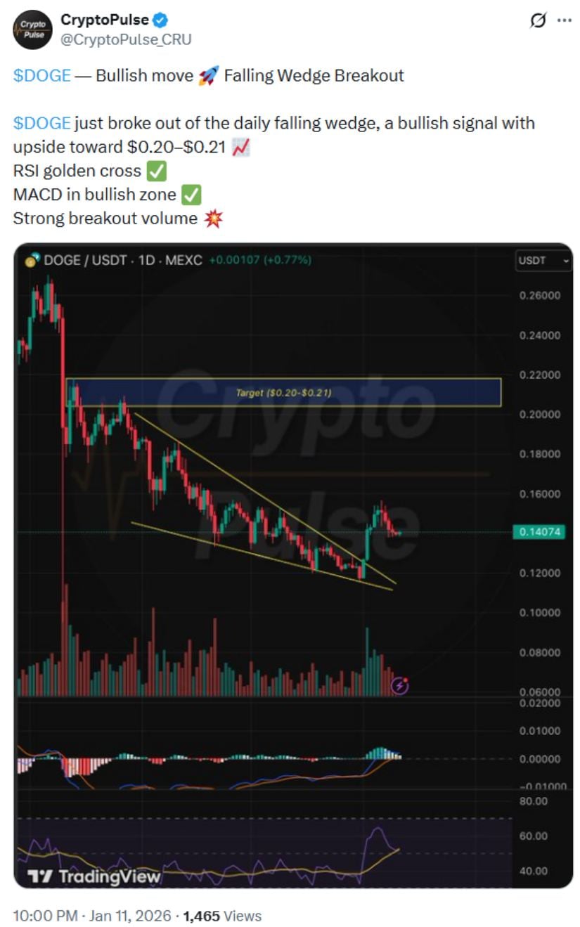 狗狗币日线级别下降楔形看涨突破已获确认,支撑因素包括放量、RSI金叉和MACD看涨动能,上行目标看向0.20-0.21美元区间。来源:@CryptoPulse_CRU via X